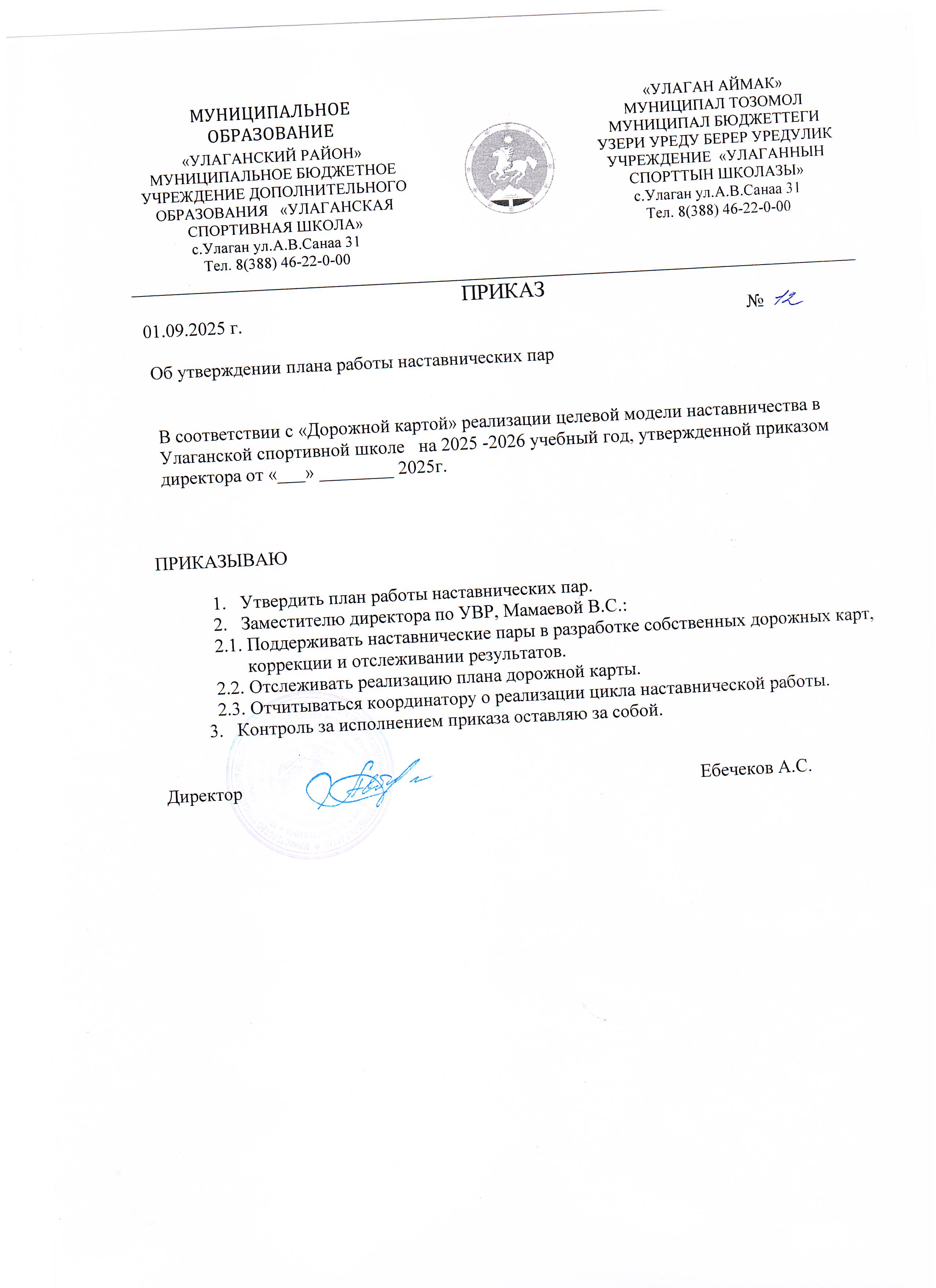 Приказ № 12 от 01.09.2025 г. "Об утверждении плана работы наставнических пар"