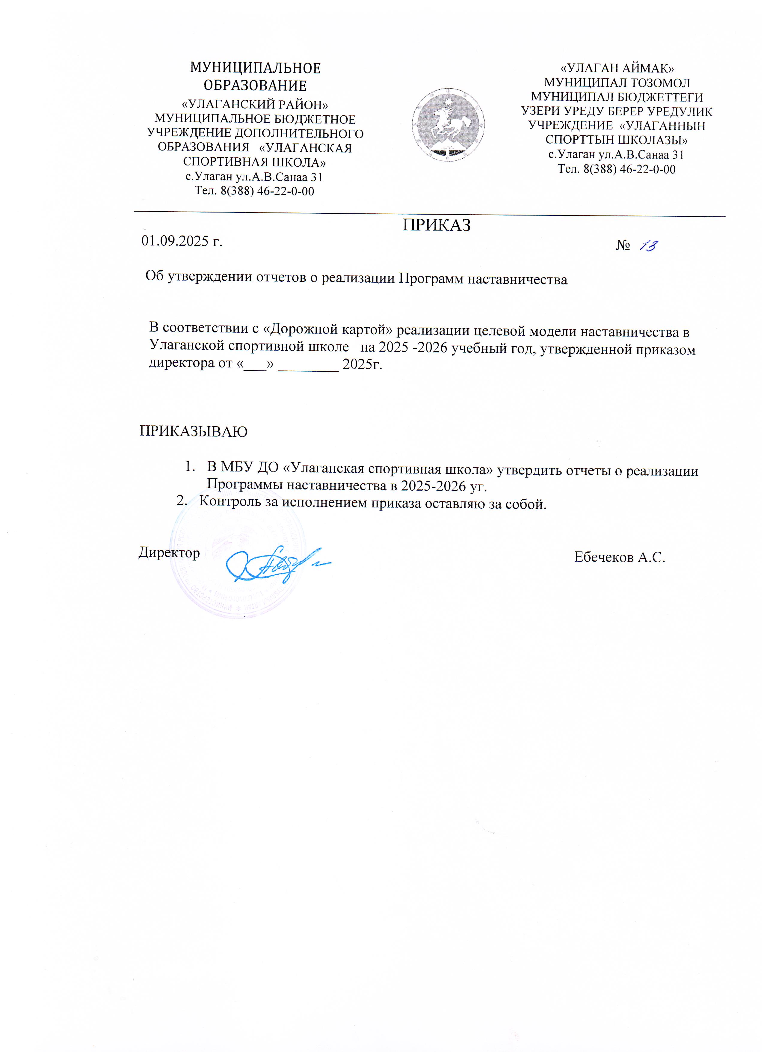 Приказ № 13 от 01.09.2025 г. "Об утверждении отчетов и реализации Программ наставничества"